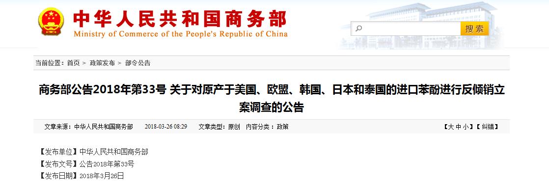 中國(guó)商務(wù)部網(wǎng)站3月26日發(fā)布公告(2018年第33號(hào))決定對(duì)原產(chǎn)于美國(guó)、歐盟、韓國(guó)、日本和泰國(guó)的進(jìn)口苯酚進(jìn)行反傾銷(xiāo)立案調(diào)查。以下為公告內(nèi)容: